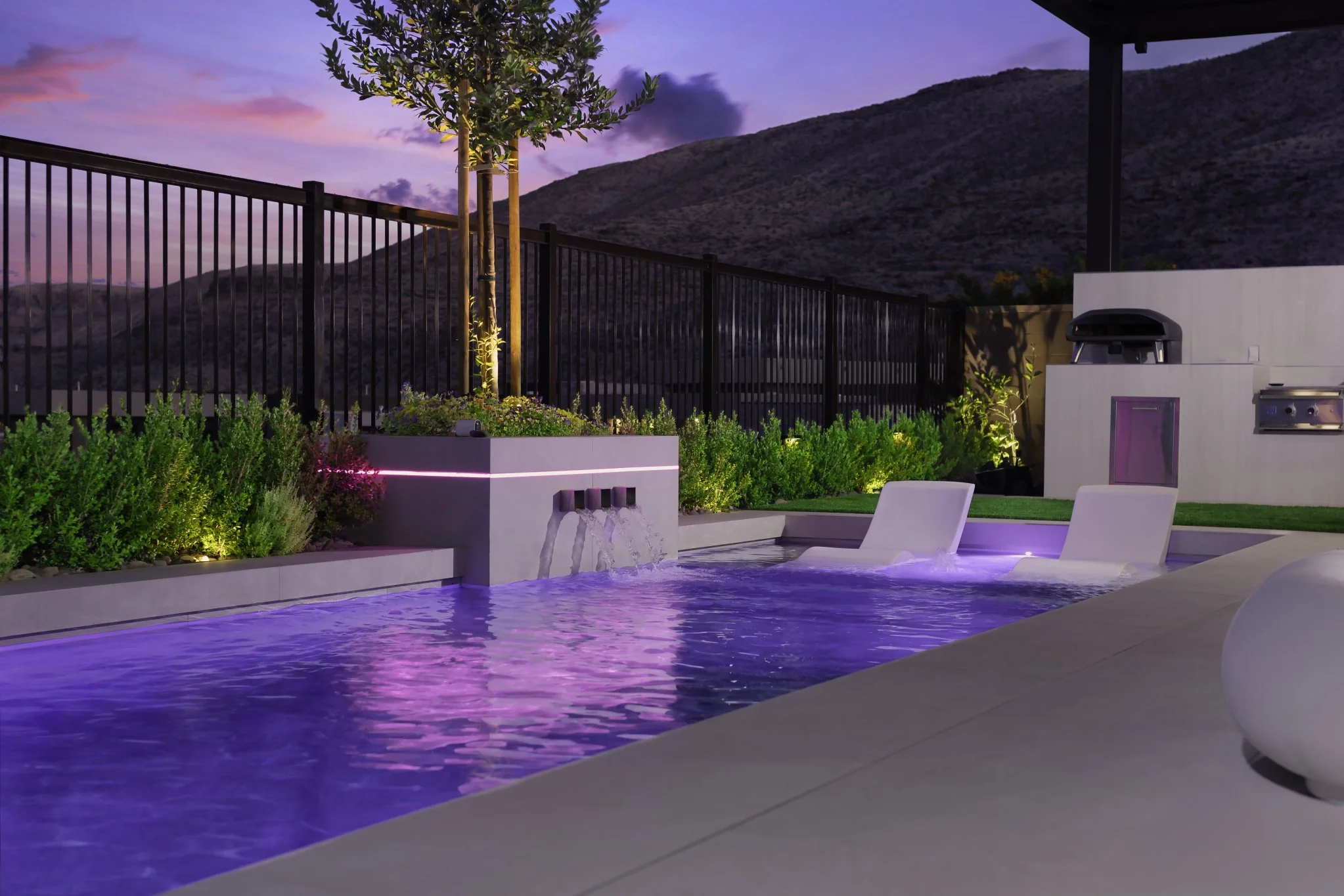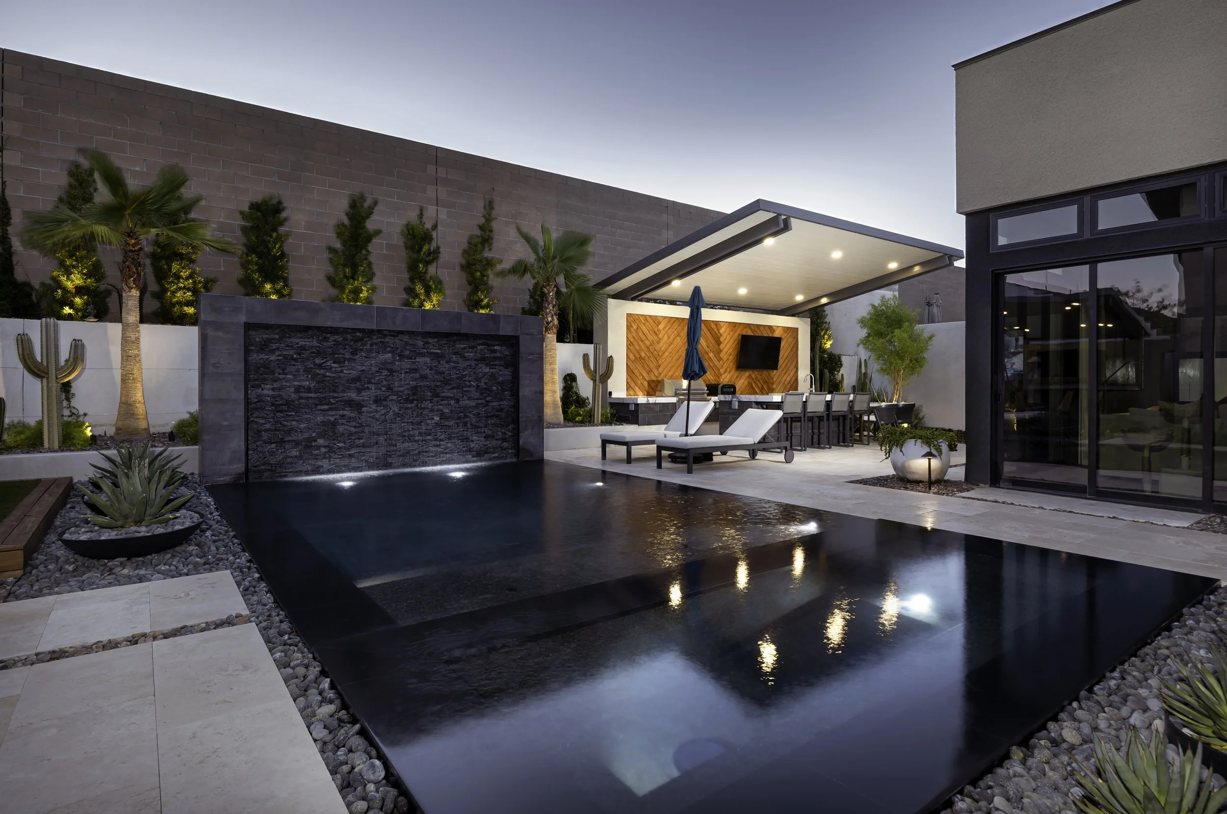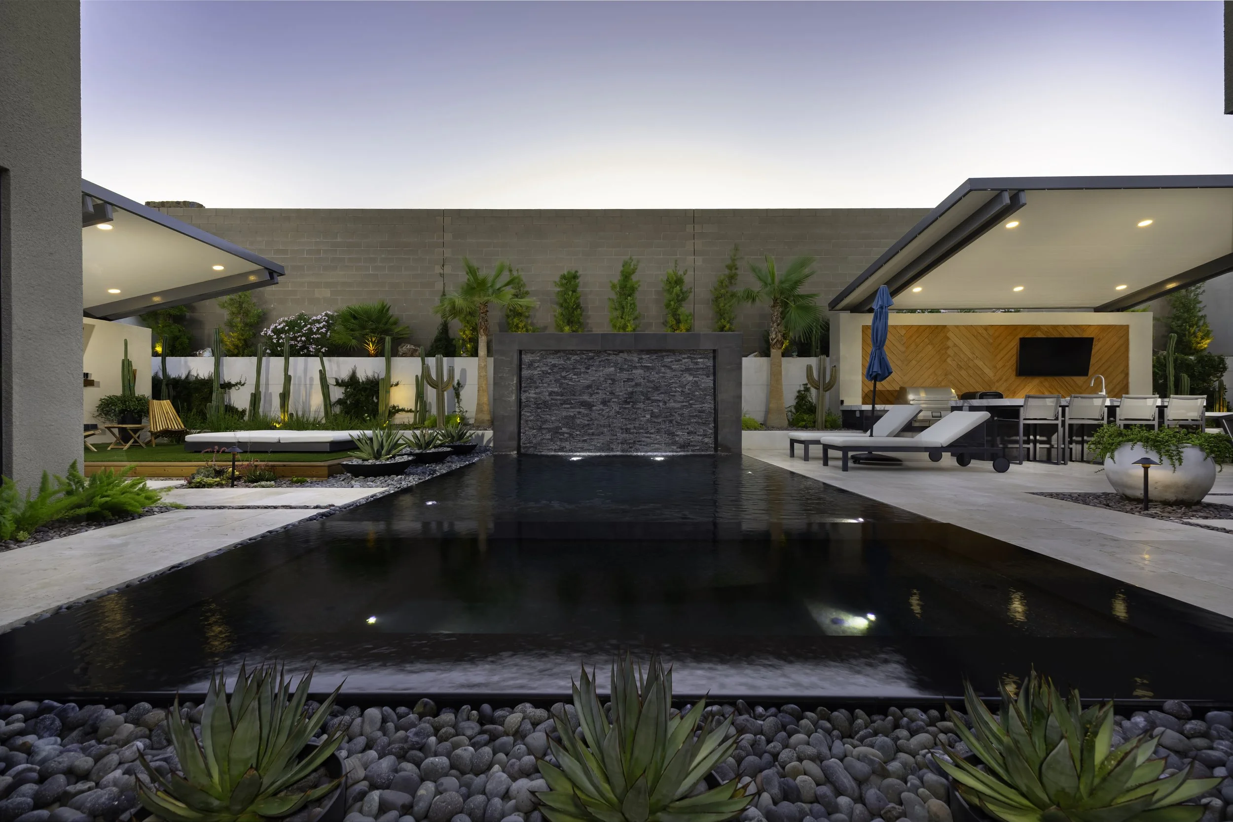 Modern backyard with a pool, water feature, lounge chairs, outdoor dining area, and landscaped plants at dusk.
