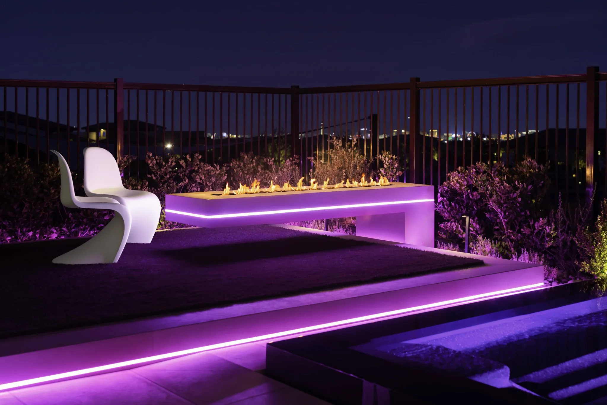 Nighttime outdoor rooftop patio with two white modern chairs, a long rectangular fire feature with flames, purple lighting accents, plants, and a dark cityscape in the background.