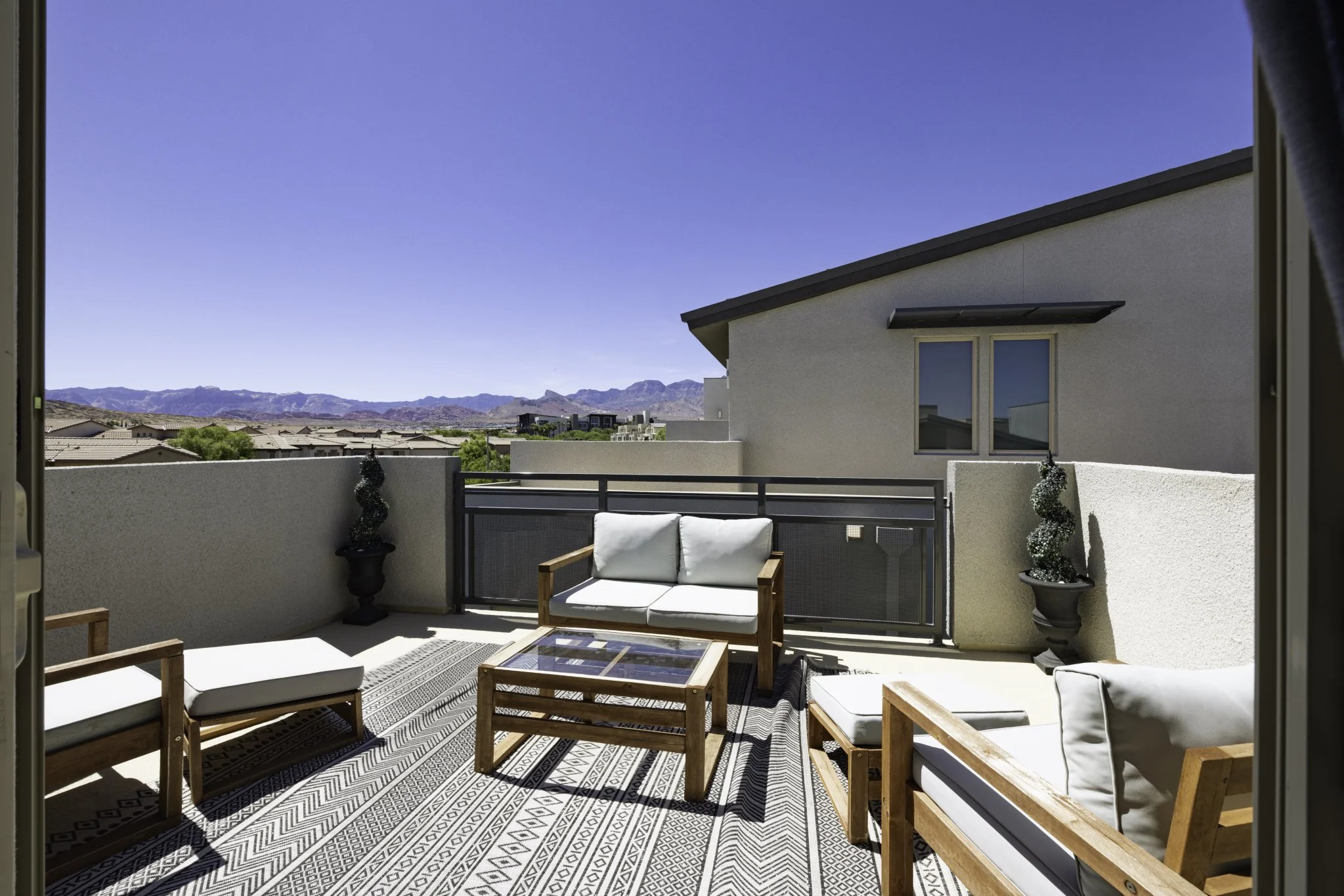 Outdoor balcony with modern furniture, including a wooden sofa with white cushions, glass-topped coffee table, and matching chairs, with potted plants and a mountain view in the background.