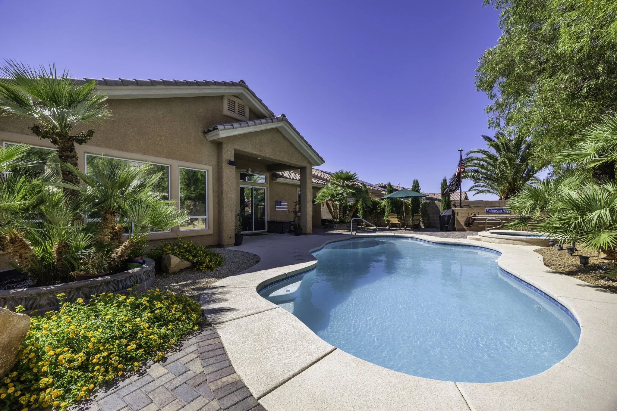 Backyard with a kidney-shaped swimming pool, surrounded by a concrete deck and desert landscaping, adjacent to a beige house with a covered patio, palm trees, and a blue sky.