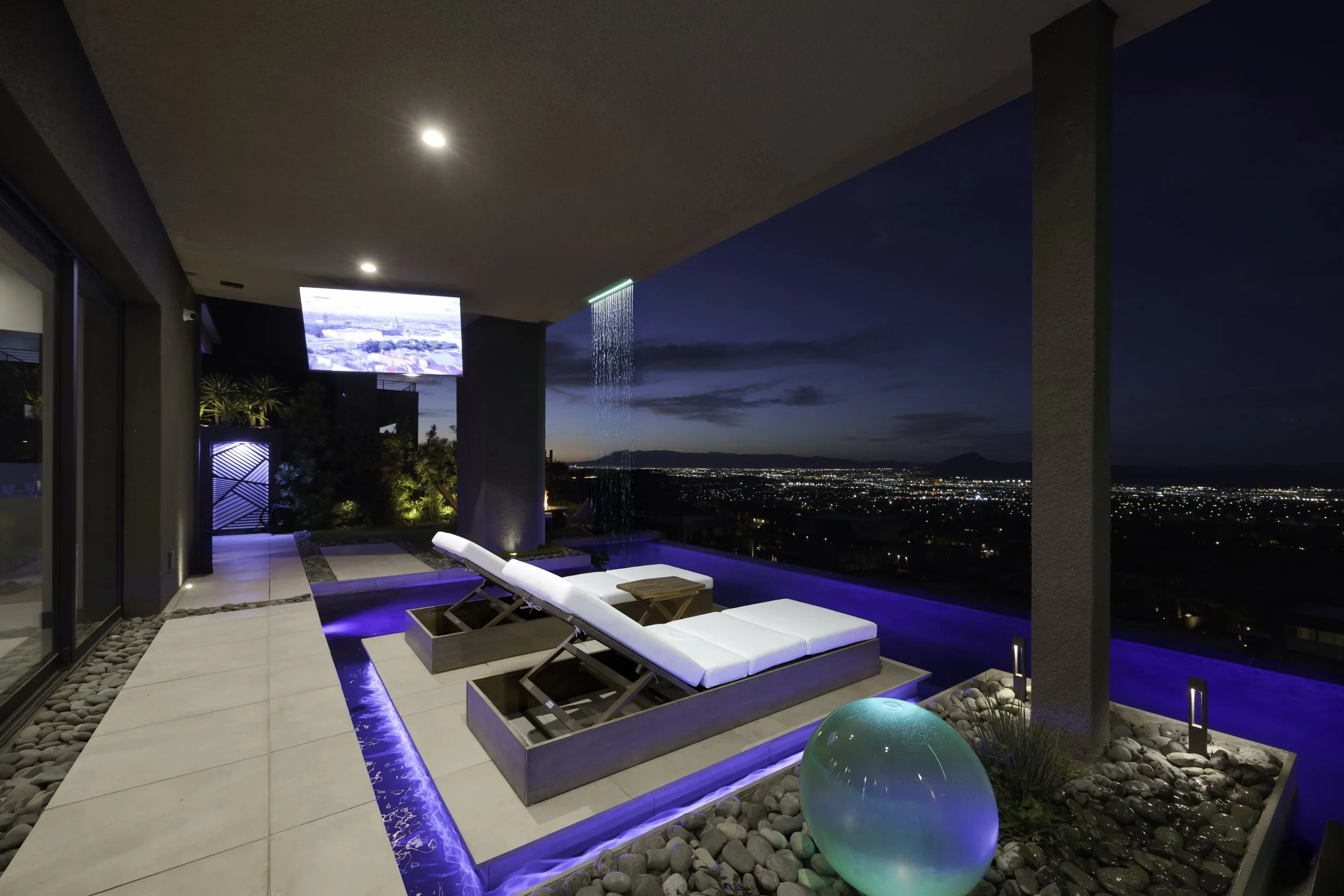 Night view of a modern house patio with a lit infinity pool, poolside lounge chairs, and large glass doors revealing an interior with a television and seating area.