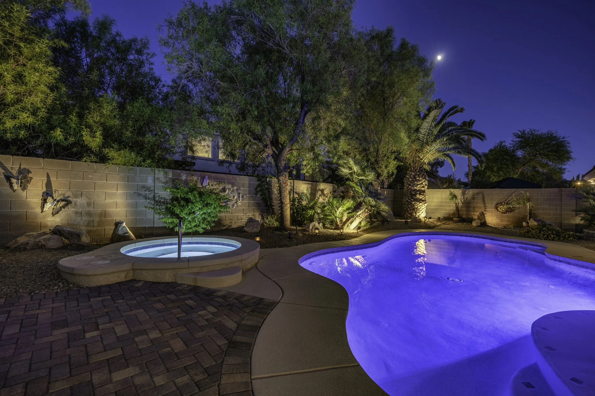Backyard at night featuring a lit swimming pool with underwater lighting, a hot tub with built-in lighting, a brick patio, desert plants, trees, decorative wall-mounted butterfly sculptures, and landscape lighting under a dark sky with visible moon.