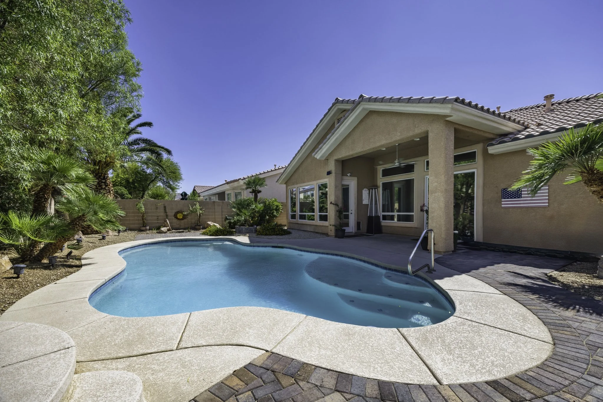 Backyard swimming pool surrounded by lush green plants and shrubs, with a patio and house in the background under a clear blue sky.