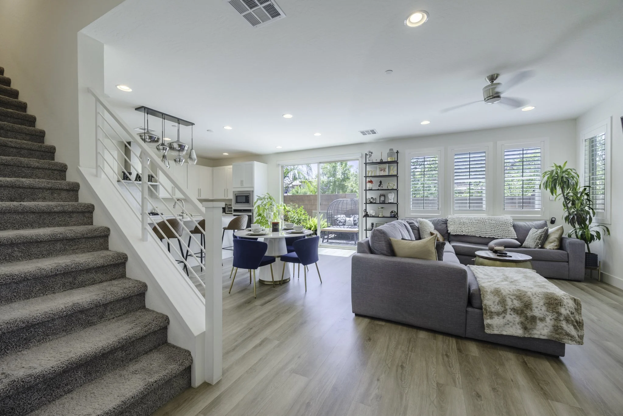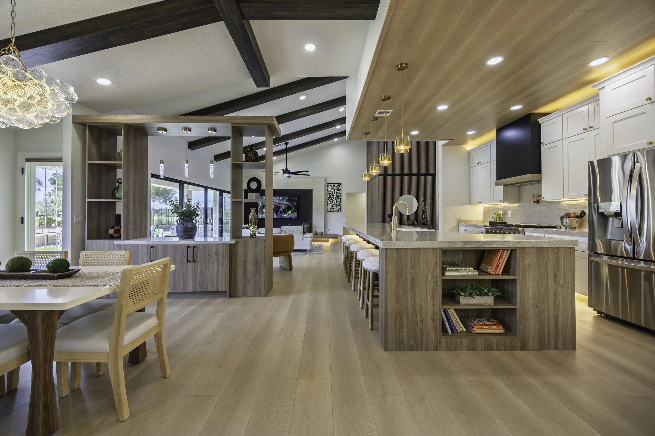 Open concept living room and kitchen with wood accents, large windows, and modern decor.