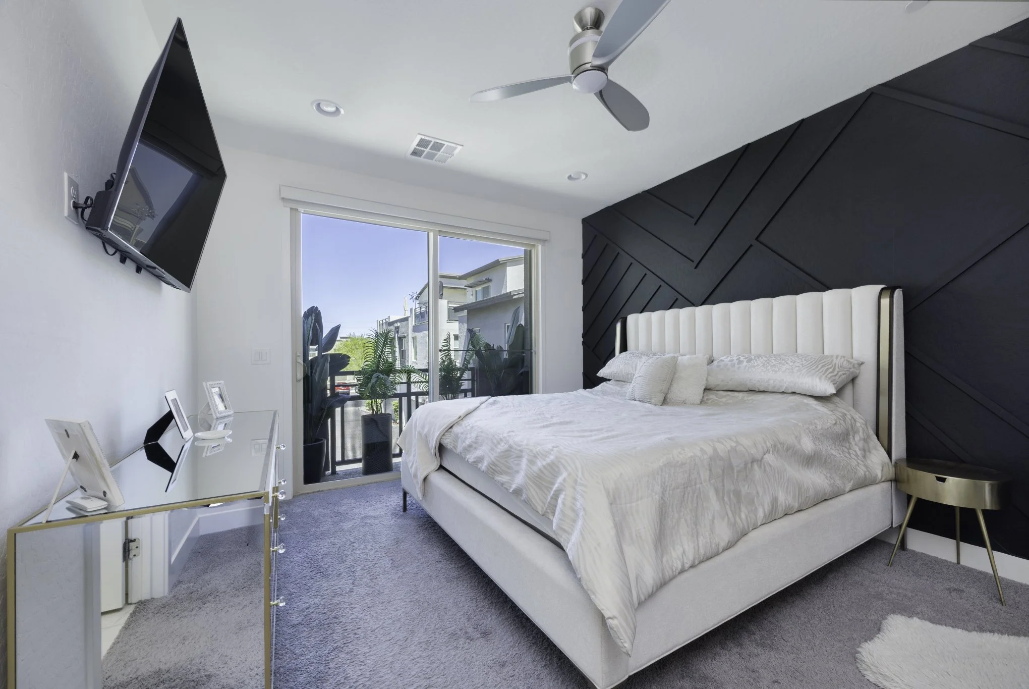 Modern bedroom with white bed, black geometric accent wall, sliding glass door with outdoor plants, wall-mounted TV, and a gold side table.