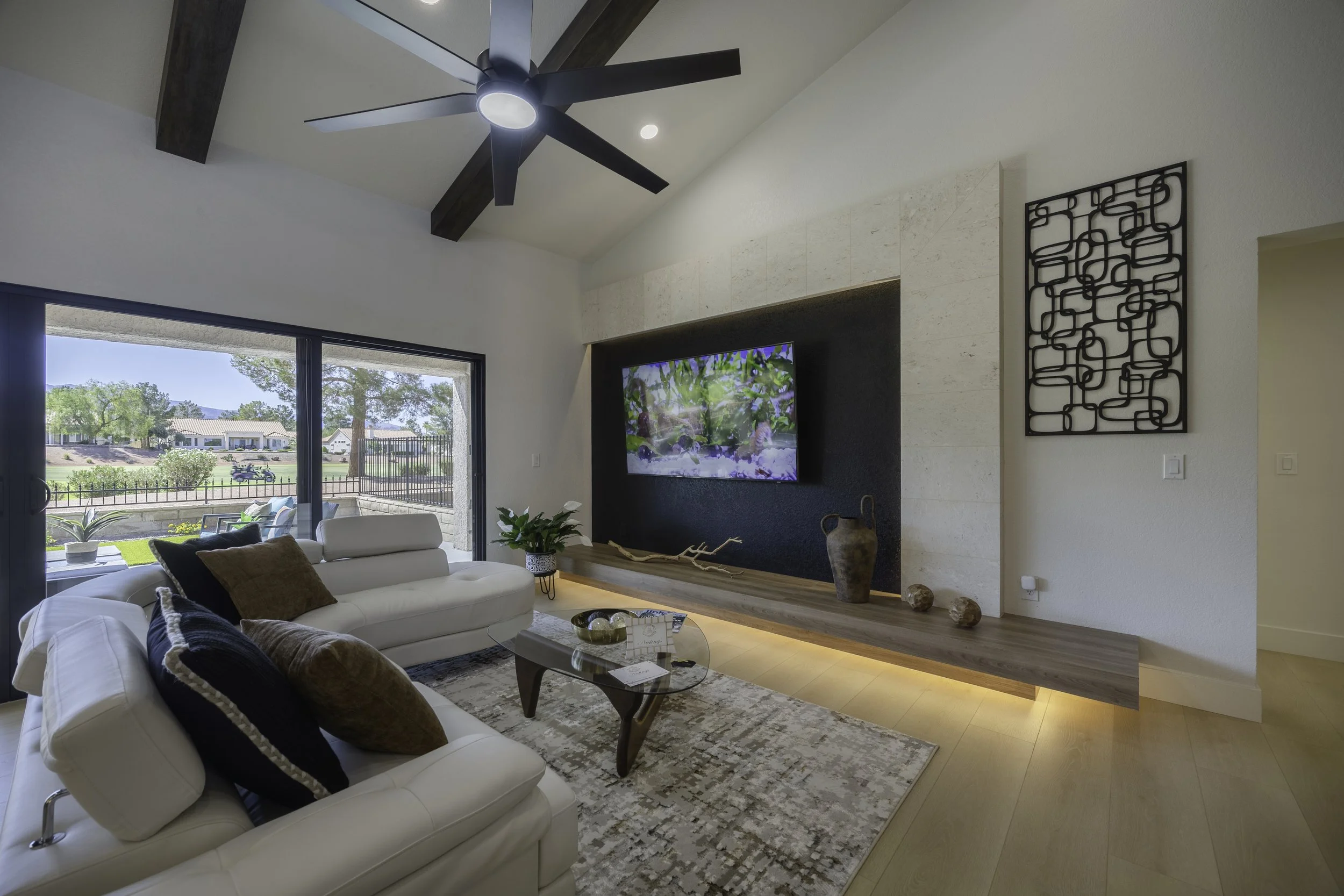 Modern living room with white sectional sofa, brown and black pillows, glass coffee table, patterned rug, large window with view of outdoor patio, mountain landscape, and houses, ceiling fan, large flat-screen TV on dark accent wall, wooden shelf wit