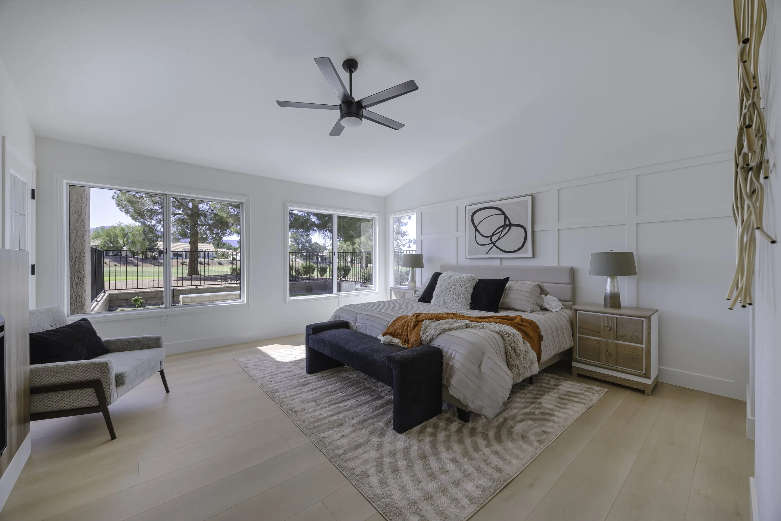 Bright bedroom with large windows, modern black ceiling fan, bed with beige and black pillows, light wood nightstands with lamps, abstract wall art, beige rug, and a gray armchair.