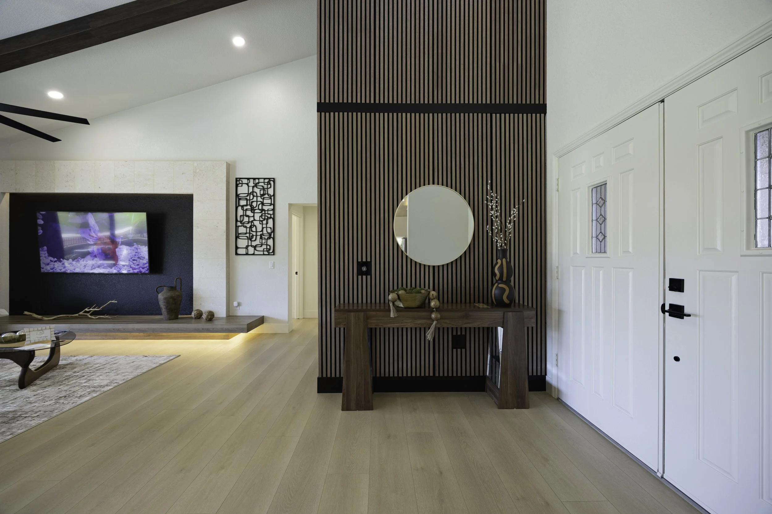 Modern living room with a wooden console table, a round mirror, decorative vases, and artwork on the wall. There is a white front door and a television mounted on the wall in the background.