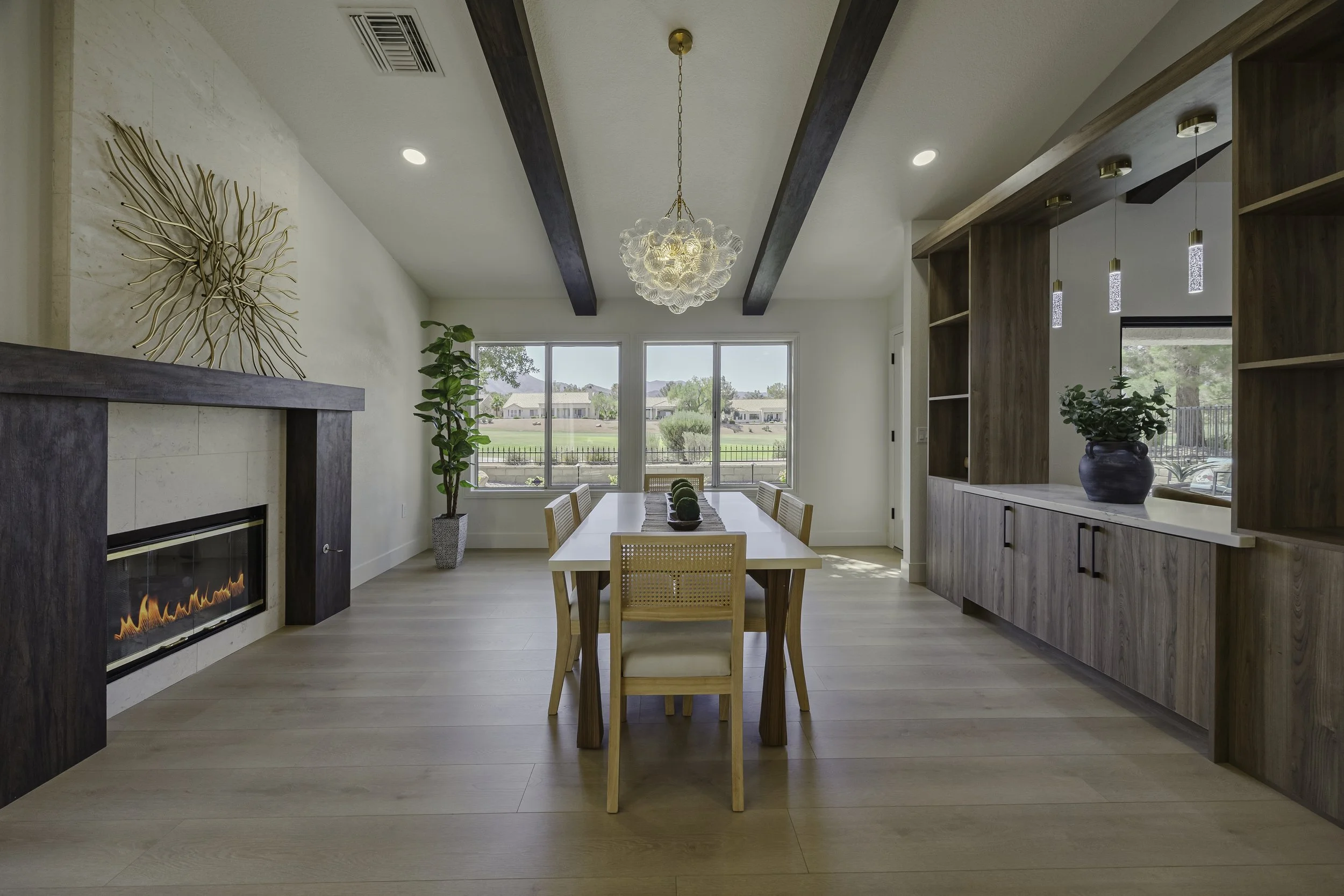 Modern dining room with light wood flooring, a white dining table, six wooden chairs, a fireplace with a dark wood surround, large windows facing a green lawn, built-in wooden shelves, a large plant, and decorative lighting fixtures.