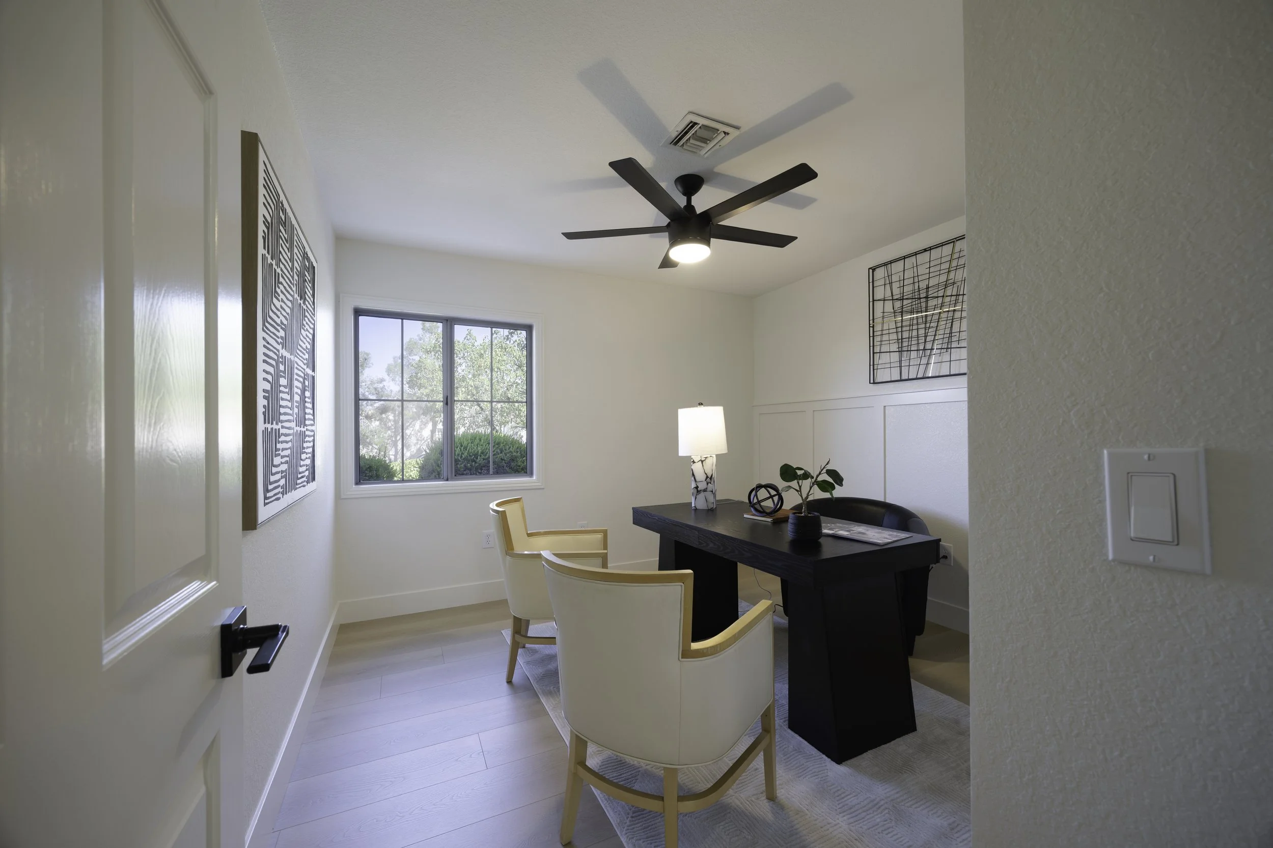 An office or study room with a black desk, two cream chairs, a white table lamp, and a potted plant on the desk. There is a window with greenery outside, wall art, and a black ceiling fan.