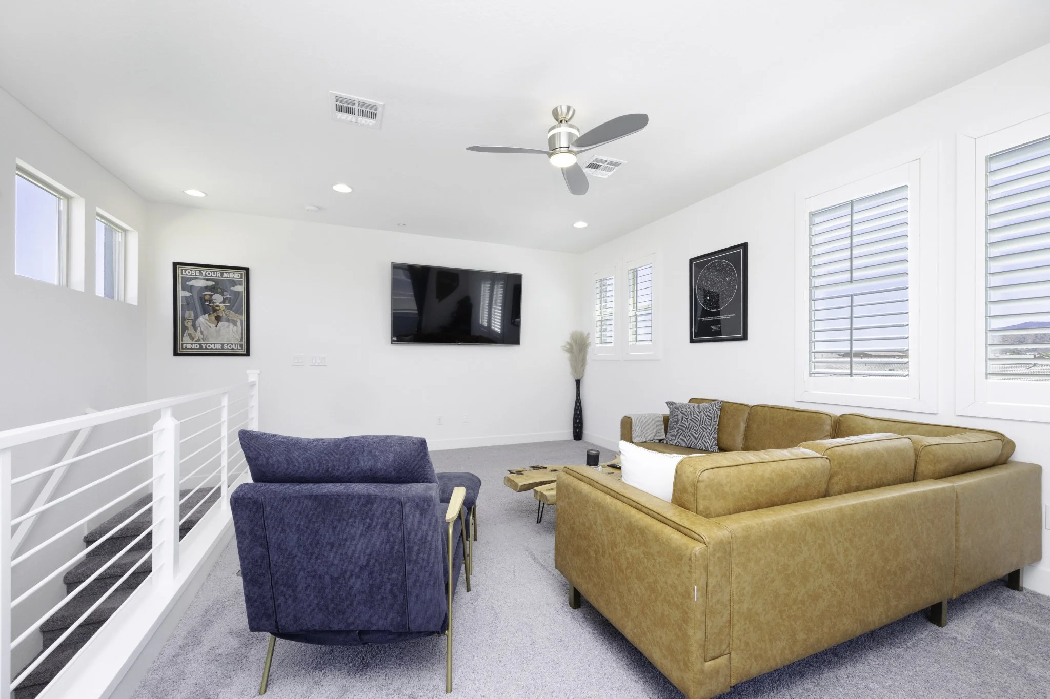 Living room with a tan sofa, a blue armchair, a flat-screen TV on the white wall, large windows with plantation shutters, and framed artwork and a tall vase with pampas grass.