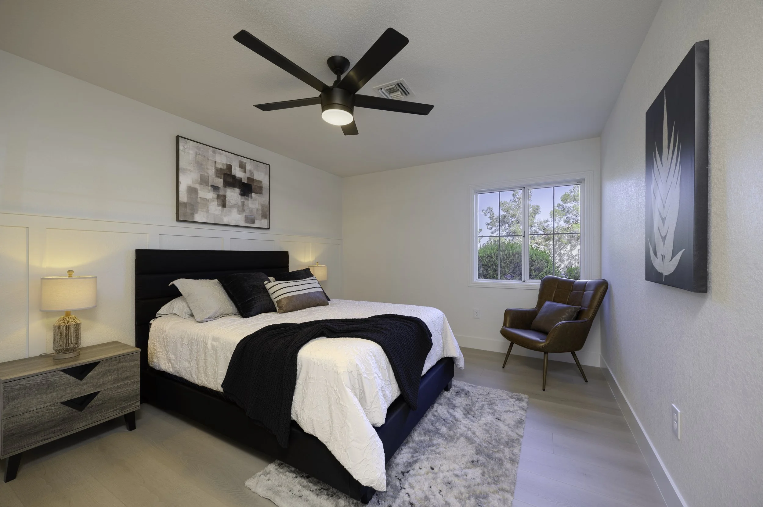 A modern bedroom with a black bed frame and white bedding, black and gray decorative pillows, a wooden nightstand with a lamp, a brown armchair, abstract wall art, a large window showing trees outside, and a ceiling fan.